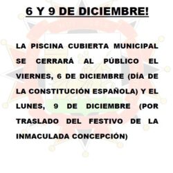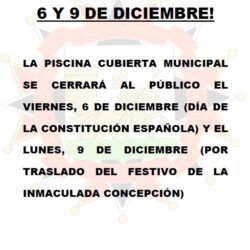 Cierre piscina cubierta festividades del 6 y 9 de diciembre