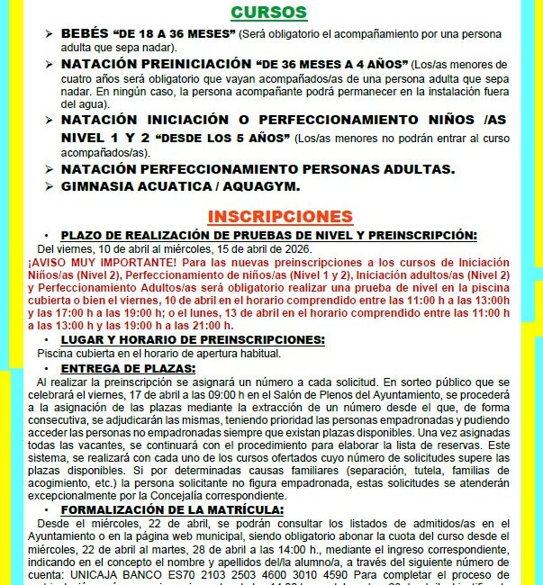 Cursos de Natación Piscina Cubierta Mayo-Junio 2026