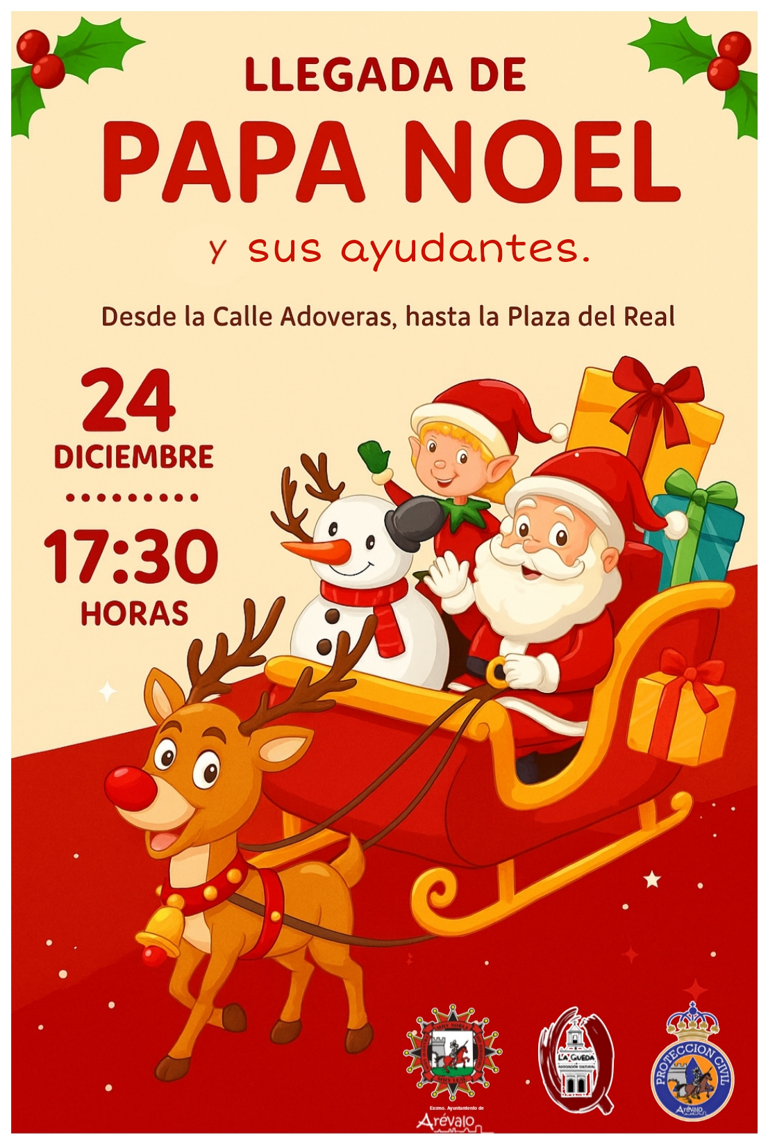 En la calle Adovares hasta la Plaza del Real,LLEGADA DESDE EL POLO NORTE DE PAPA NOEL Y SUS AYUDANTES.A continuación, desfile hasta la Plaza del Real.Colabora Asociación “La Queda”. |